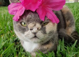 Cat Born With Heart-Shaped Nose Loves Wearing Flower Hats