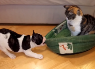 Watch Puppy Adorably Battle a Cat to Reclaim His Bed